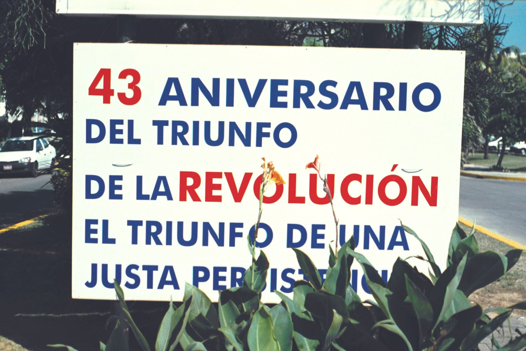 This billboard is celebrating 2002 as the 43rd anniversary of the 1959 Revolution. It is a way of using public space to remember and to keep the momentum of the Revolution going.