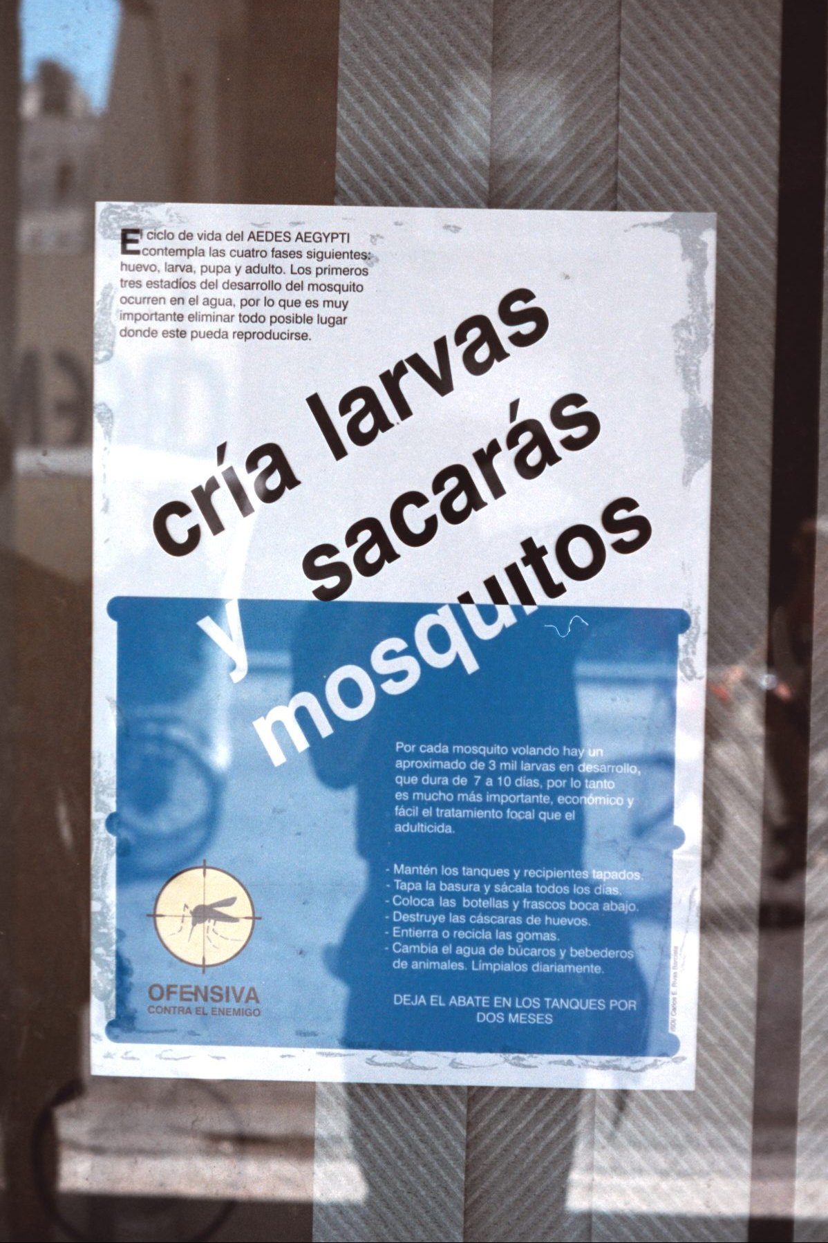 This poster is one of the many found on any given street spreading information about a recent virus being transmitted through mosquito bites. It describes the virus and what to for someone who gets bit. Cubans were able to neutralize the virus threat very quickly because the word got out about the issue. Posters like this were partly responsible for the victory.