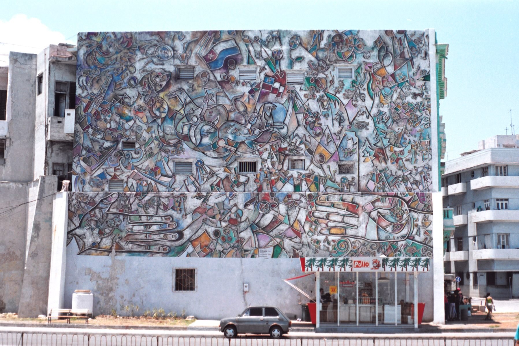Large murals like this one dot the walls of many communities throughout Havana. It is a comfortable infusion of art in society that adds a healthy creative value to the surrounding space. These murals are parallel to criminalized American hip hop youth whose graffiti murals wish to beautify abandoned urban buildings and create a culture of discussion of current events.